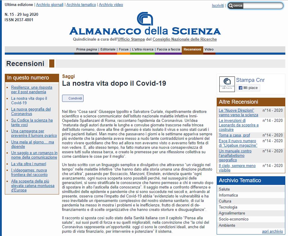 Cosa sarà recensito su Almanacco della Scienza CNR, 29/07/2020