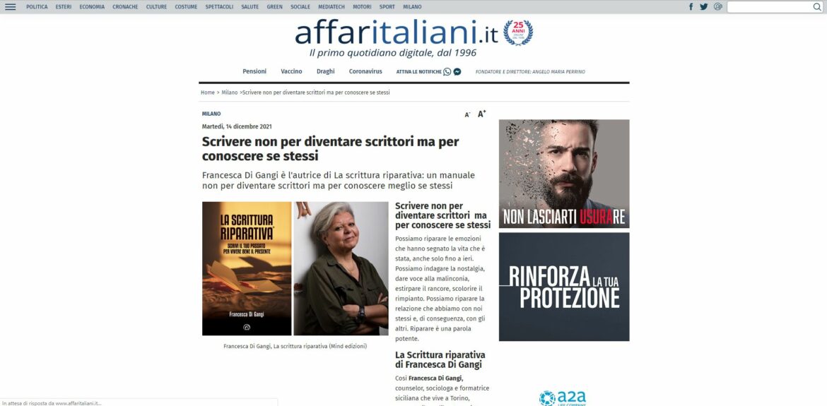 La scrittura riparativa di Francesca Di Gangi su Affaritaliani.it, 14/12/2021