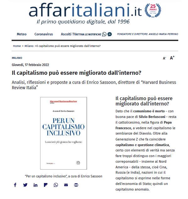 Per un capitalismo esclusivo a cura di Enrico Sassoon presentato da “Affaritaliani.it”, 17/02/2022