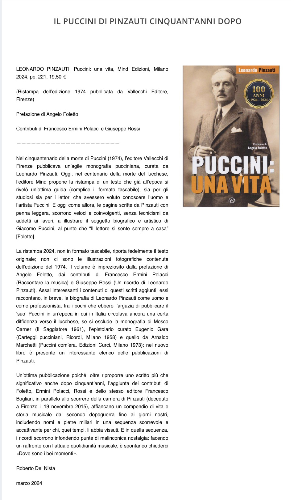 L’Opera International Magazine, mensile di riferimento per la musica lirica, dedica una recensione di Puccini: una vita a firma di Roberto Del Nista.