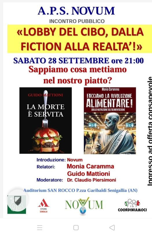 L’Associazione di Promozione Sociale Novum organizza un incontro pubblico sui temi dell’alimentazione e del cibo, con l’intento di informare sui pericoli che possono celarsi negli alimenti di più largo consumo, con l’aiuto degli  autori Monia Caramma (Cerealiantichi e moderni, La verità, vi prego, sul cibo, Facciamo la rivoluzione alimentare!) e Guido Mattioni (La morte è servita).