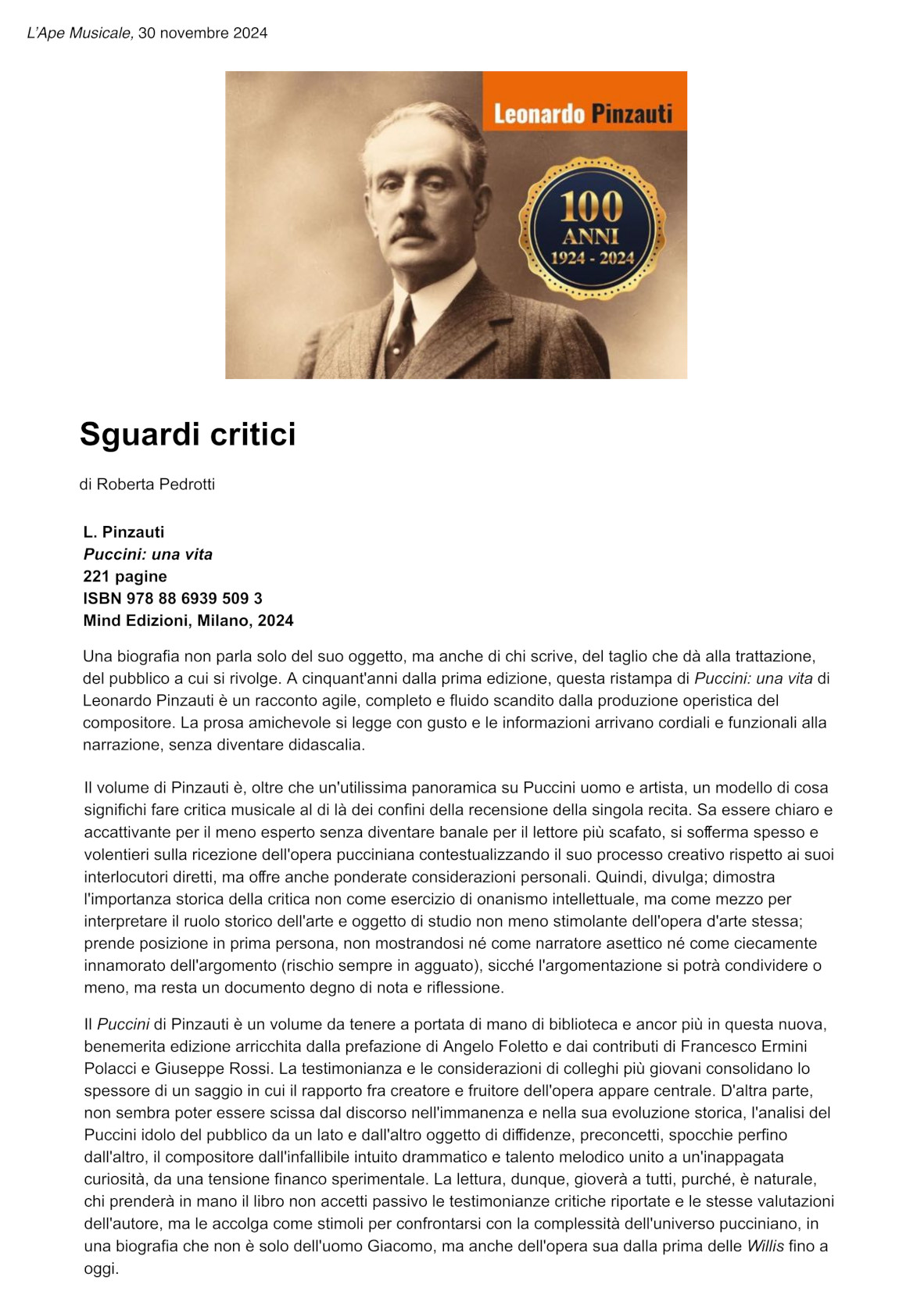 di Roberta Pedrotti di Puccini: una vita , pubblicata sul sito de L’Ape musicale, rivista di musica, arti, cultura (30 novembre 2024).