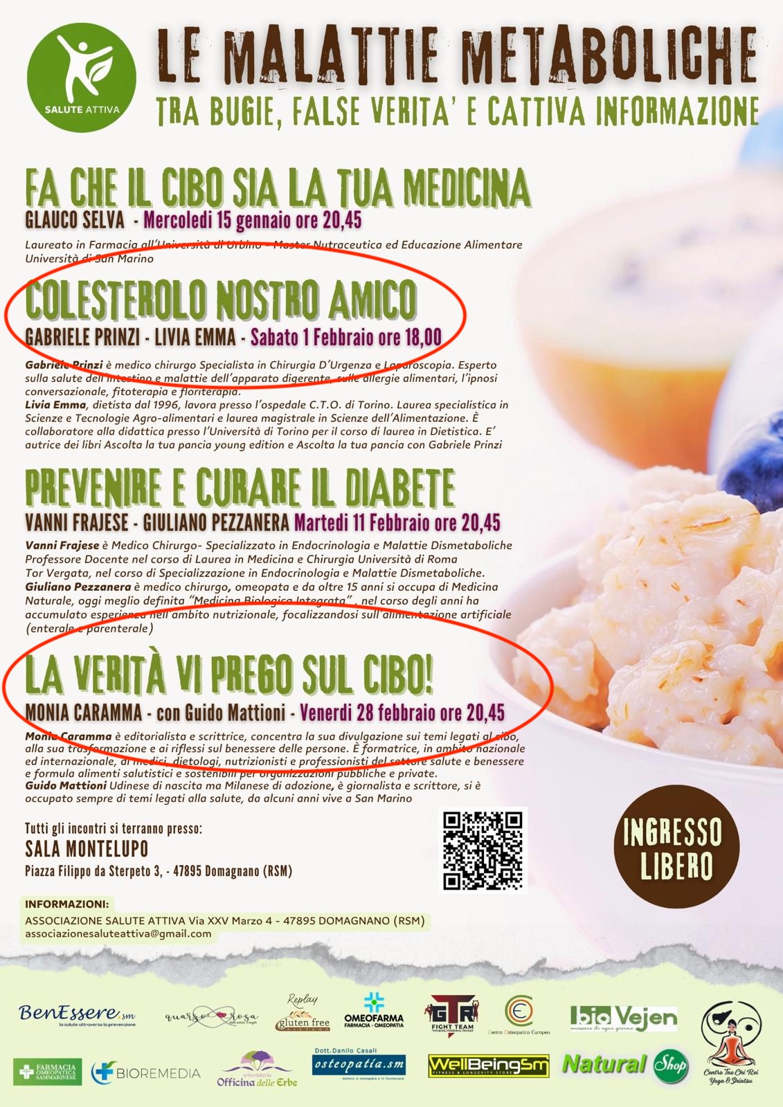L’associazione Salute Attiva di San Marino terrà nel mese di febbraio una serie di incontri dedicati al tema “Le malattie metaboliche tra bugie, mezze verità e falsa informazione”. Parteciperanno anche gli autori di Mind Edizioni Monia Caramma (Facciamo la rivoluzione alimentare!, La verità, vi prego, sul cibo, Cereali antichi e moderni), Livia Emma (Ascolta la tua pancia, Ascolta la tua pancia Young Edition), Gabriele Prinzi (Ascolta la tua pancia) e Guido Mattioni (La morte è servita).